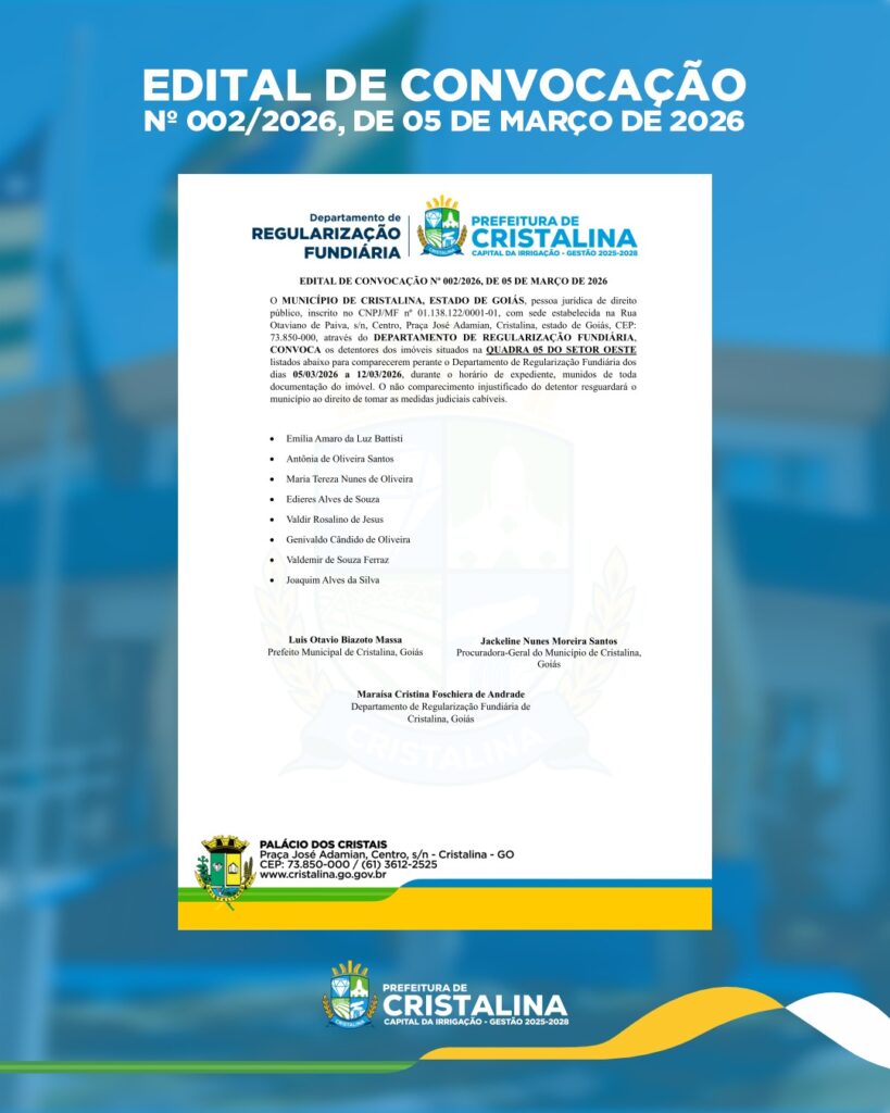 A Prefeitura de Cristalina, por meio do Departamento de Regularização Fundiária, publicou o Edital de Convocação nº 002/2026, destinado aos detentores de imóveis localizados na Quadra 05 do Setor Oeste.