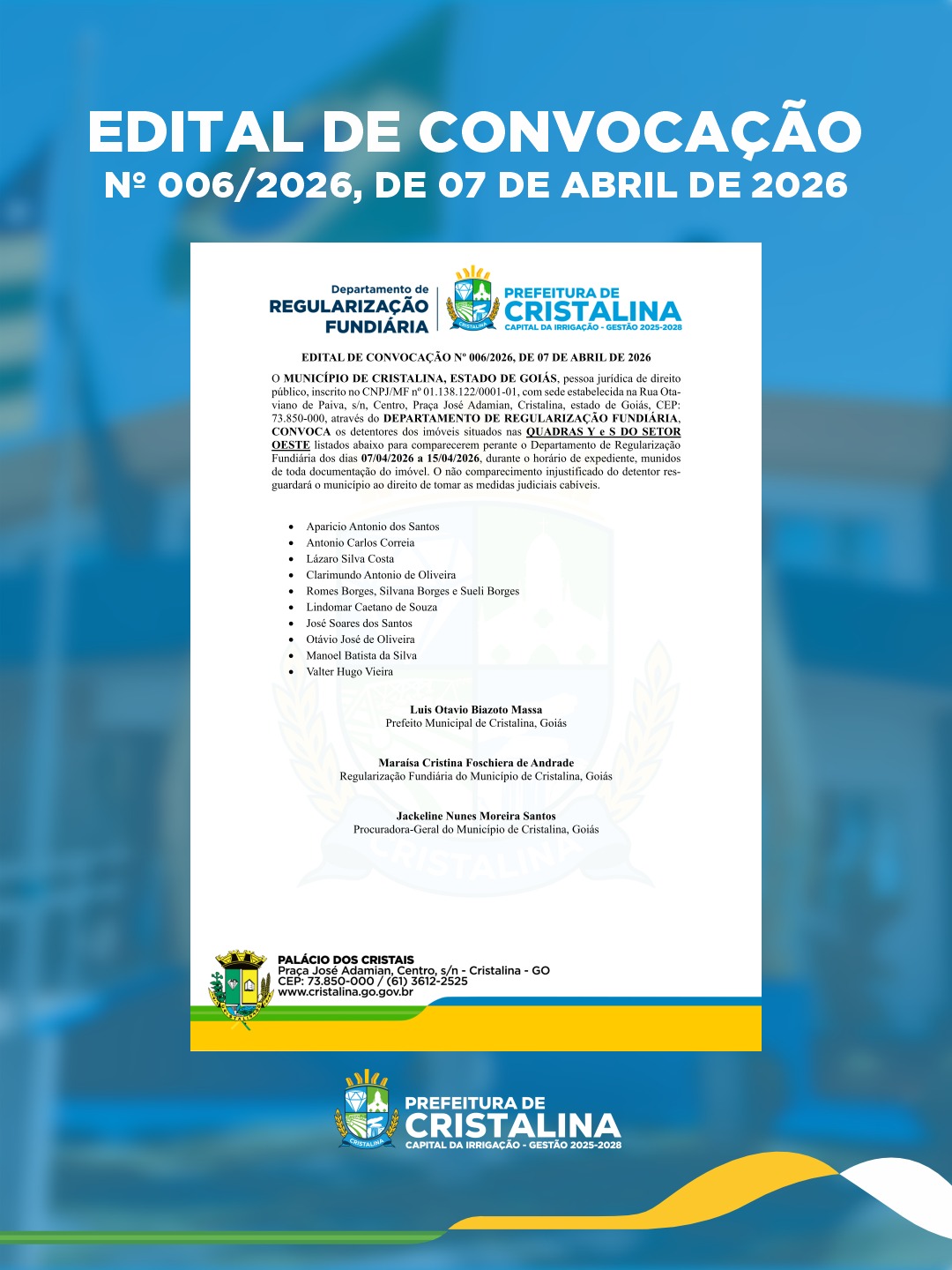 A Prefeitura de Cristalina, por meio do Departamento de Regularização Fundiária, torna público o Edital de Convocação nº 006/2026, de 07 de…